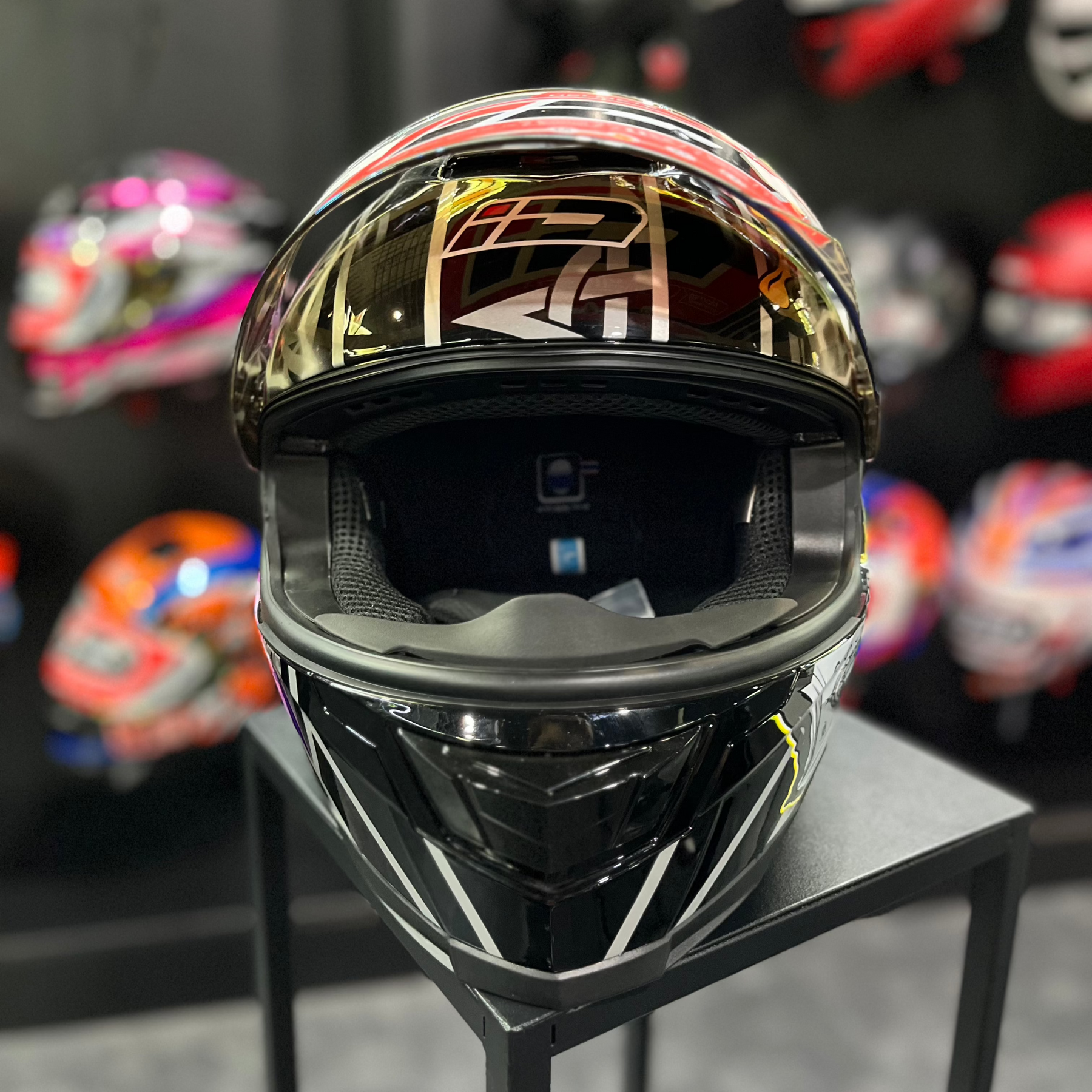 - แผ่นหน้าหมวกนิรภัยมุมมองกว้าง วัสดุ Polycarbonate เคลือบสีปรอทอิริเดียมทอง เคลือบกันรอยขีดข่วน