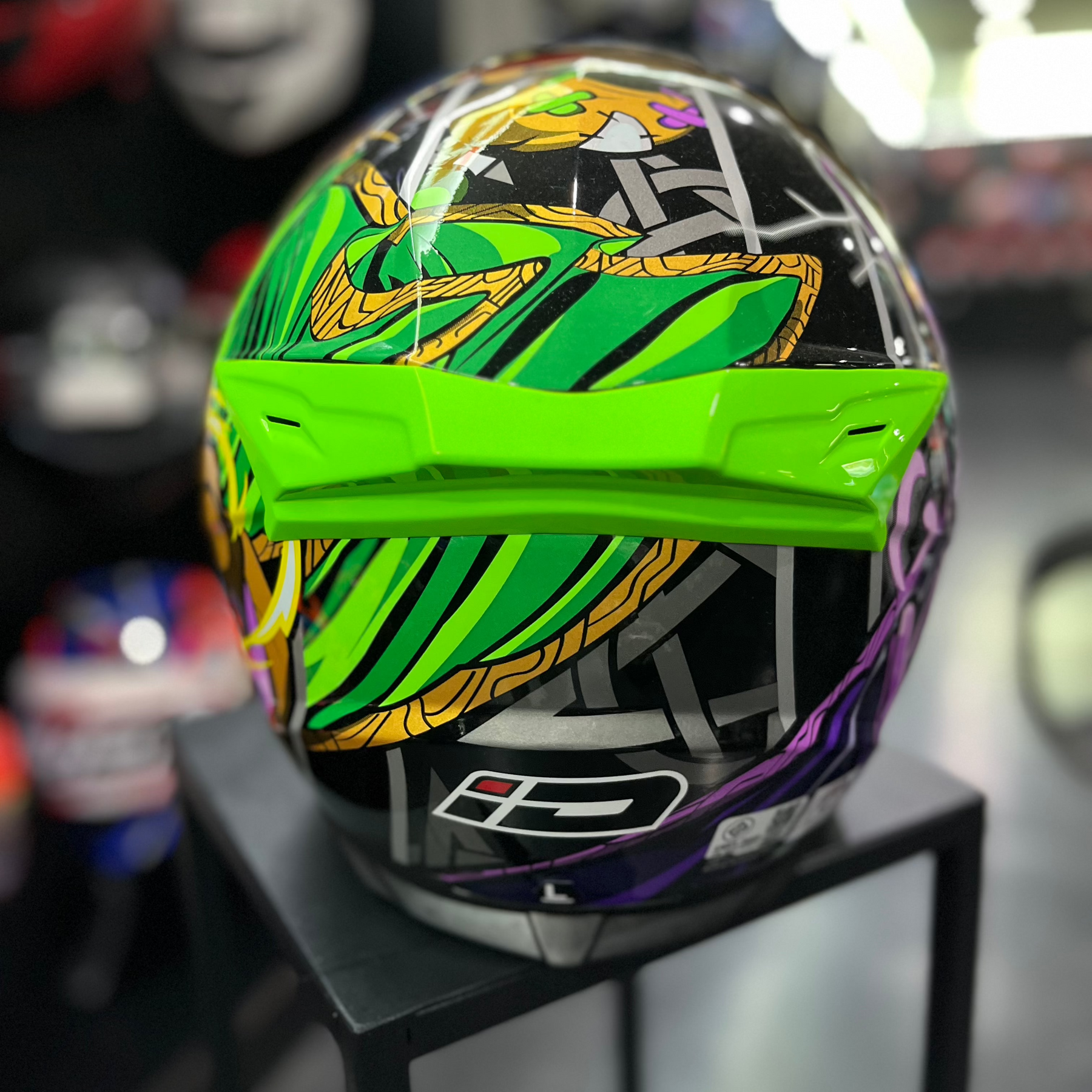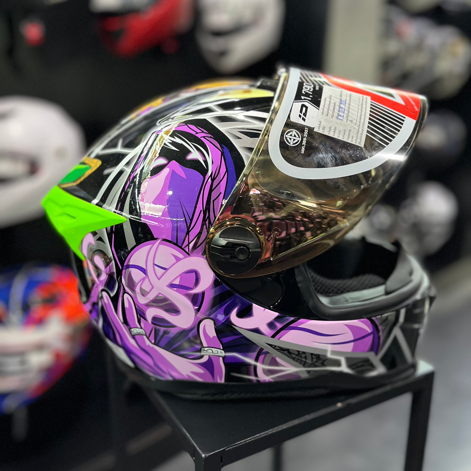 - มีแผ่นปิดใต้คาง shin curtain เก็บเสียงและกันลมย้อนเข้ามาในหมวก